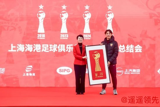 总结会尾声,上海市人民政府副秘书长周亚明向俱乐部董事长张敏赠送了刻有“不止冠军、不止廿年”字样的木雕雄鹰,激励俱乐部振翅高飞,勇攀新高。上海市副市长解冬还向队长王燊超赠送了定制冠军奖杯刺绣,寄望海港队未来再创佳绩。最后,领导嘉宾们在印有“不止冠军 不止廿年”的卷轴上共同用印章为队徽添星,全体与会人员共同见证了这一意义非凡的时刻。海港俱乐部2025赛季总结会在温馨而热烈的氛围中圆满落幕。